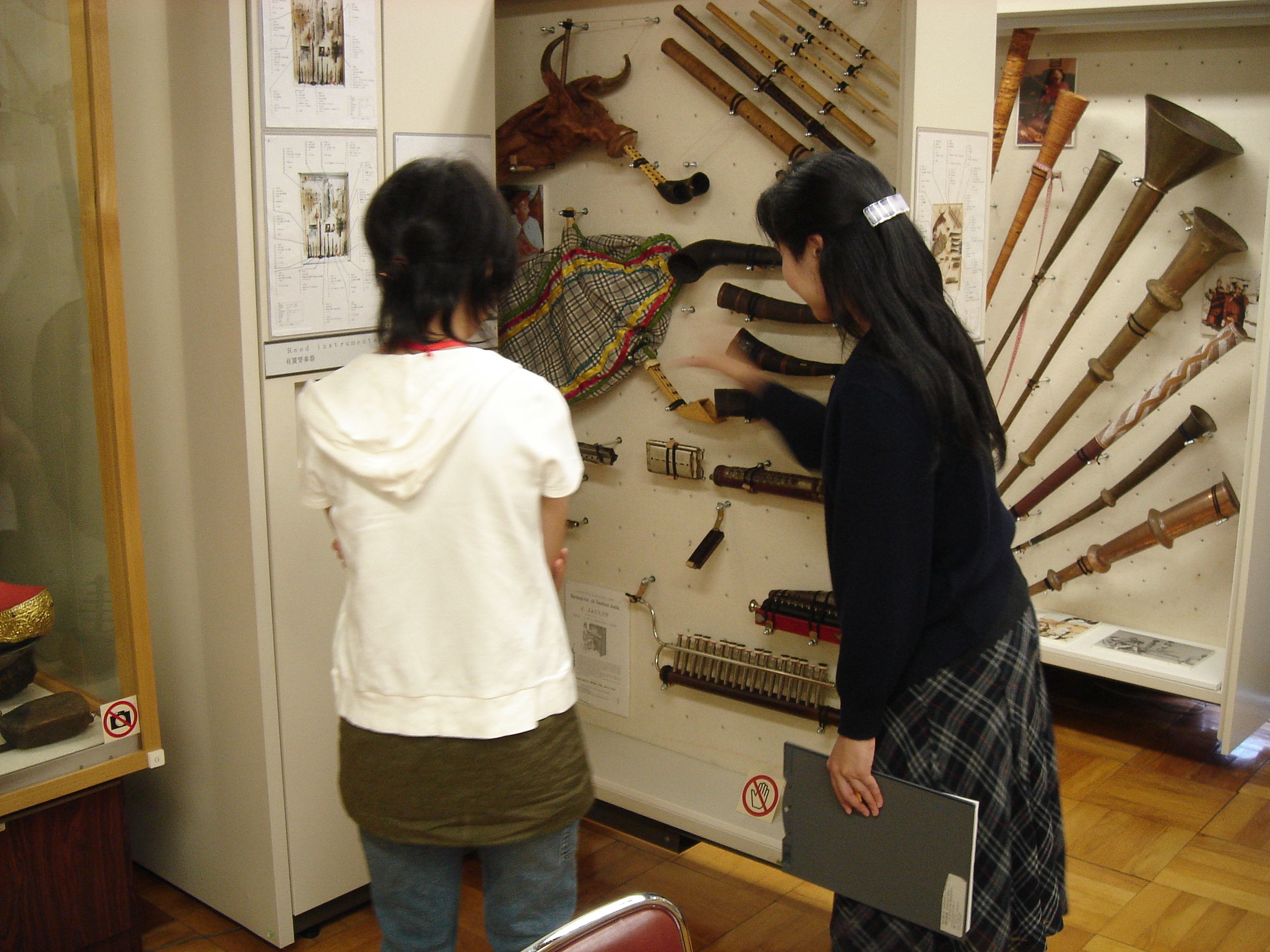 世界中の楽器を種類別に見ながら、楽器のお話を聞いたり、楽器に触れたりして学びました。